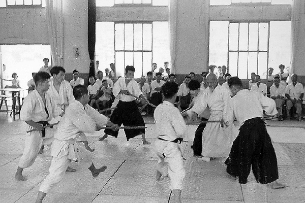 1941 : c’est l’année de consécration pour Ueshiba qui est invité à montrer son art à l’Empereur en personne en démonstration spéciale au Saineikan dojo dans les sous-sols du palais impérial. Cela s’explique par ses liens avec l’amiral Takeshita, alors au poste de grand chambellan.